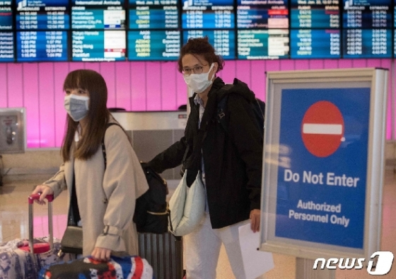 | 22일(현지시간) 미국 캘리포니아 로스앤젤레스 국제공항에 도착한 중국인 승객들이 보호 마스크를 착용하고 있다. © AFP=뉴스1 |