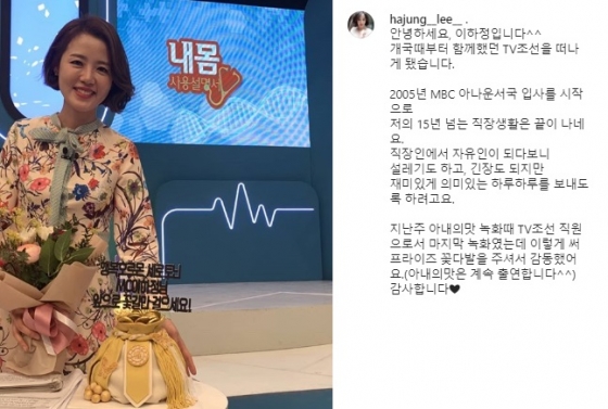 이 아나운서는 "아나운서 생활하면서 참 행복했고 감사했다. 이제 방송인으로 만나뵈겠다"며 "아내의 맛에는 계속 출연한다. 신종 코로나바이러스 잘 지나가길 바란다. 건강하시라"고 글을 맺었다.