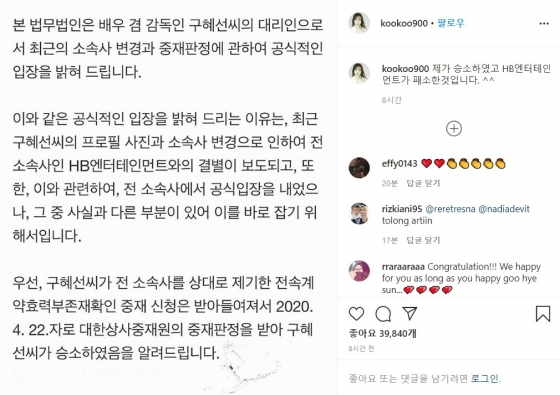 30일 구혜선은 자신의 인스타그램을 통해 “지난해 HB엔터테인먼트(전 소속사)를 상대로 제기한 전속계약 효력 부존재 확인 중재 신청은 제가 4월 22일자로 승소한 것”이라고 밝혔다.