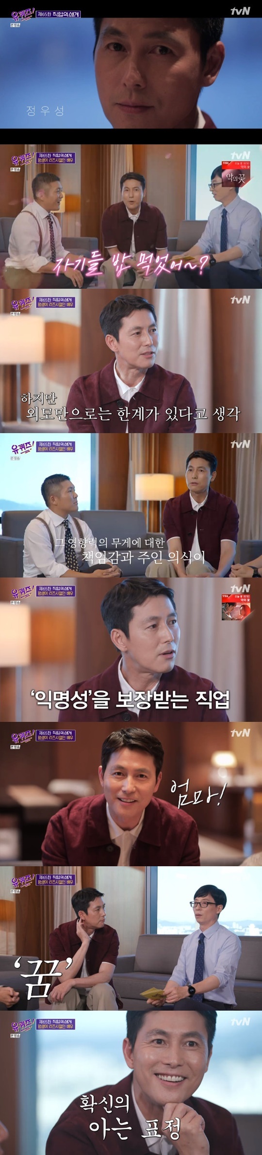 정우성은 여전히 대한민국 대표 미남으로 불리며 매번 '잘생겼다'라는 말을 듣는 것에 대해 "속마음은 늘 감사하다. '짜릿해, 늘 새로워'라고 하니까 재밌게 봐주시는 거 같다"라고 말하며 "보는 건 물린다. 내면의 무엇이 표현되느냐가 한 사람의 매력을 연장하는 거니까"라고 소신을 밝혔다.