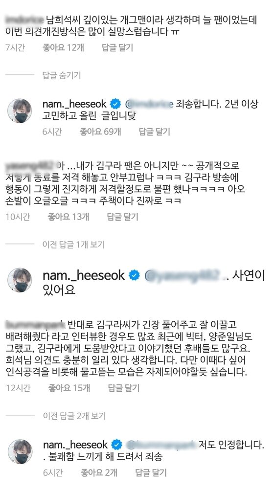 남희석은 30일 자신의 인스타그램에 한 누리꾼이 '늘 팬이었는데 이번 의견개진방식은 많이 실망스럽다'라고 하자 "죄송하다, 2년 이상 고민하고 올린 글"이라고 댓글을 달았다.