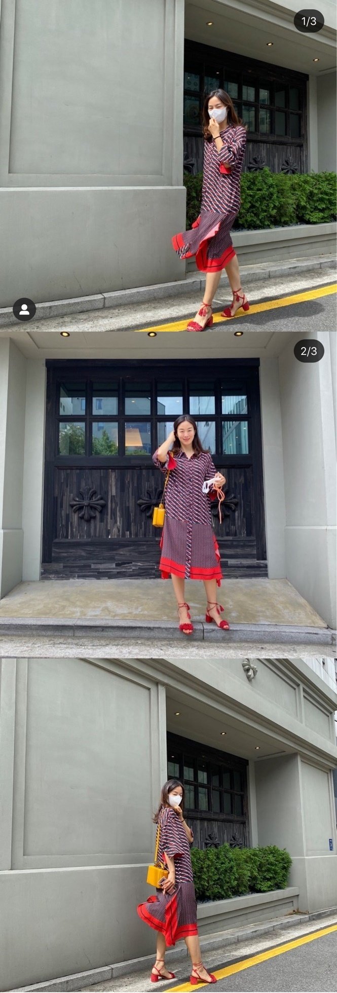 공개된 사진 속 문정원은 거리에서 마스크를 착용한 채 화려한 프린트 원피스에 노란색 백을 매치하는 패션을 보여주고 있는 모습.