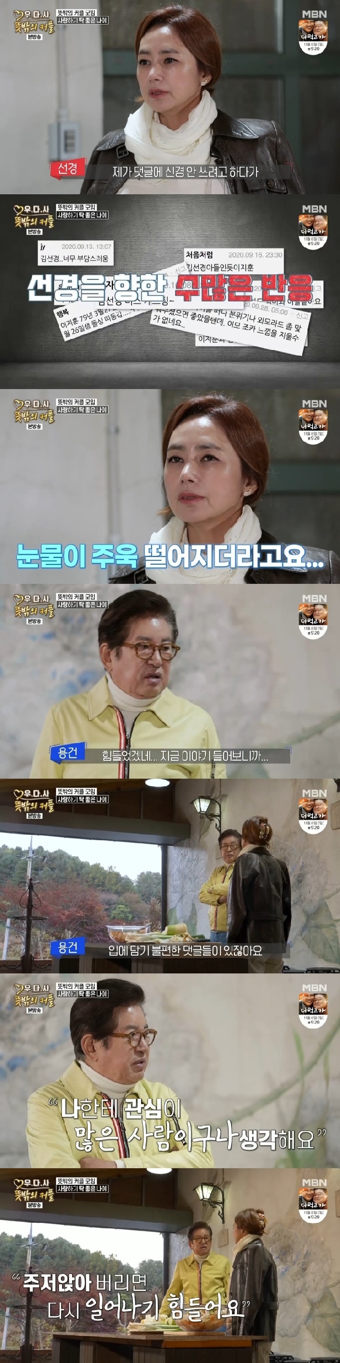김선경의 나이는 이지훈보다 11살 더 많고, 둘은 연상연하 커플로 출연 중인 상황. 김선경은 "저는 좋긴 한데 마음이 불편한 부분이 있다"라고 입을 열었다. 그는 "댓글에 신경을 안 쓰고 안 보려고 하다가 우연히 댓글을 보게 됐는데 순간적으로 그냥 멍하게 쳐다보는데 눈물이 떨어지더라"라면서 악플을 언급했다.