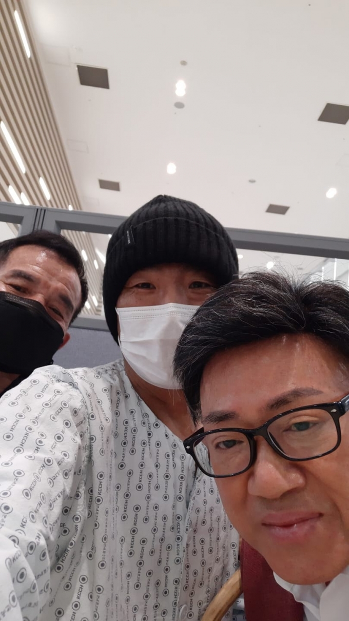 공개된 사진 속에는 김철민, 엄용수, 이용근의 모습이 담겼다. 김철민은 병원복을 입고 선배들을 맞이한 모습이다.