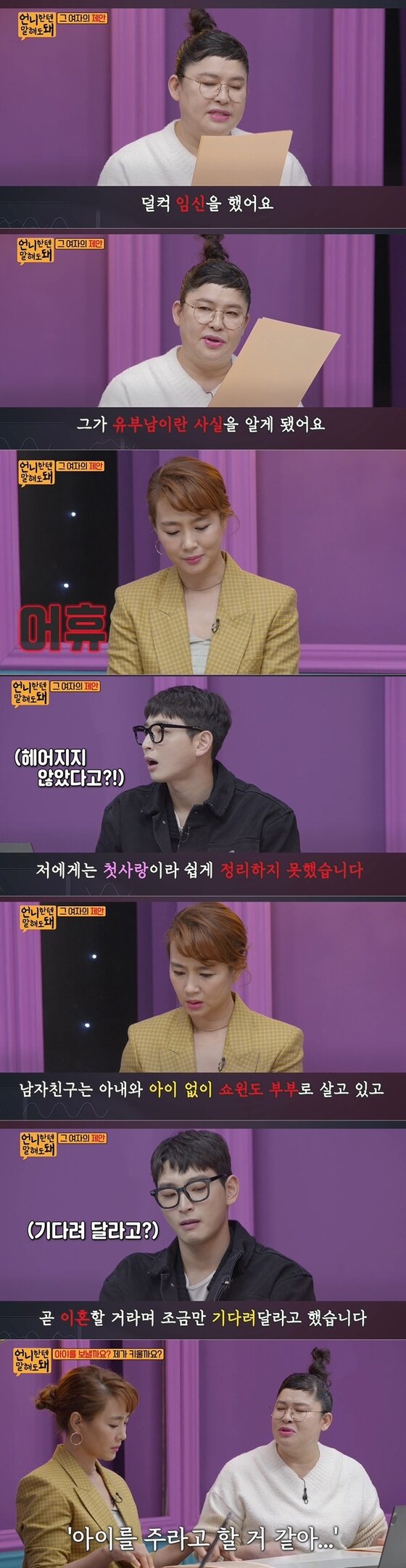 이 말에 MC들은 충격에 휩싸였다. 하지만 남자친구가 진심으로 기뻐했다고. 사연자는 "점점 배가 불러와서 퇴사했을 때는 월셋집도 구해줬다"며 "아이 낳기 직전에는 남친이 이혼을 권유했다는 것도 들었다"고 말했다.
