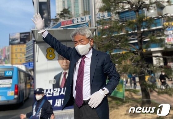 | 정규재 자유민주당 부산시장 후보가 31일 오전 수영교차로에서 거리 유세를 하고 있다.(자유민주당 제공) |