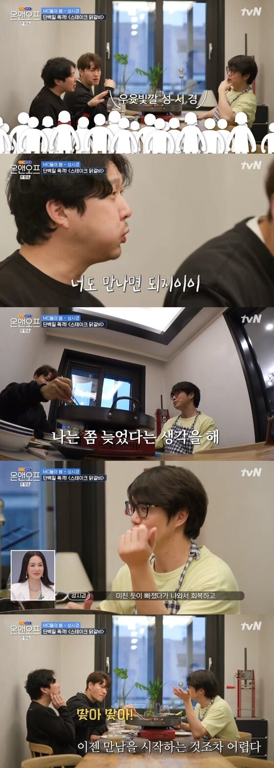 성시경은 "(나이가 들수록) 이제는 피곤하고 무릎도 안 좋고 점점 고장나지 않냐. 그러니까 마음이 급해지는 거다"라며 "옛날에는 (사랑에) 빠졌다가 회복하고 다시 하면 됐는데 지금은 그러지 못할 것 같다"라고 솔직한 생각을 밝혀 눈길을 모았다.