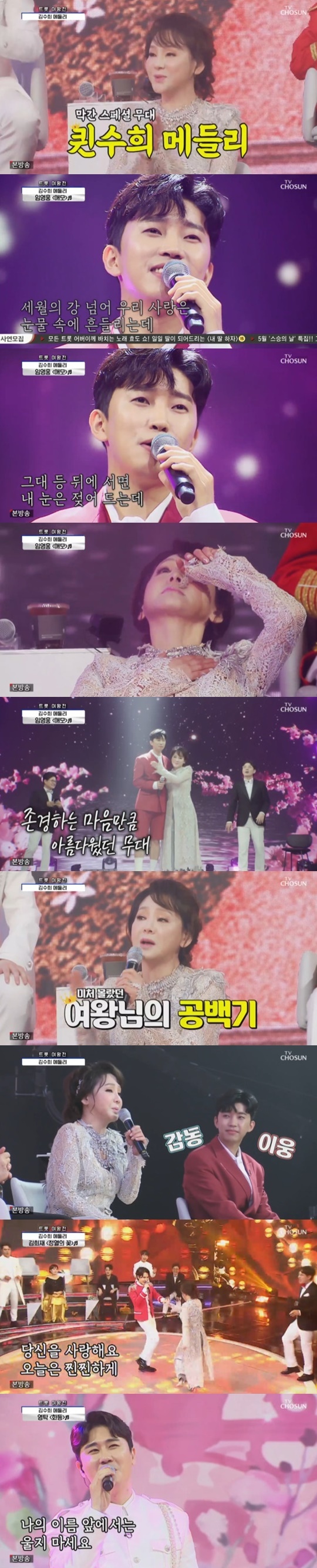 이어 김희재가 '정열의 꽃', 영탁이 '화등'을 열창하며 메들리 무대에 다채로운 볼거리를 더했다.