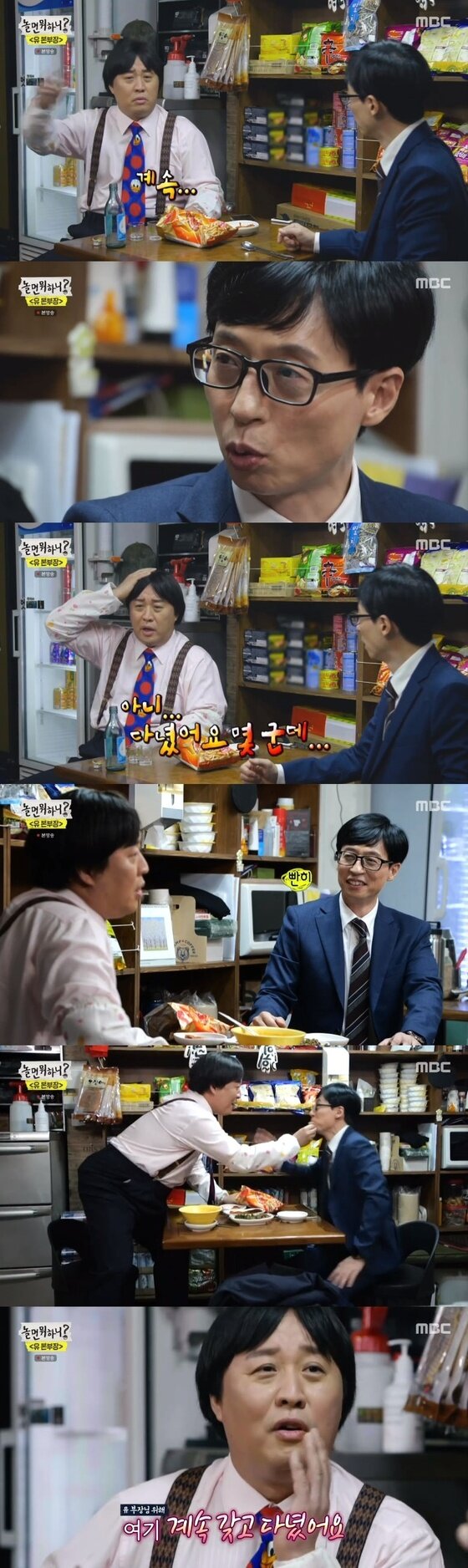 유 본부장이 정준하를 마주친 곳은 저녁 무렵 들어간 한 라면 가게였다. 라면을 먹으며 자신만의 힐링 시간을 즐기던 유 본부장은 자신의 앞에서 익숙한 뒷모습을 보고 흠칫했다. 발가락이 드러난 무좀 양말에 슬리퍼를 신은 채 과자를 소주에 찍어 먹고 있던 사람은 무한상사에서 함께 했던 영업3팀 정과장 정준하였다.