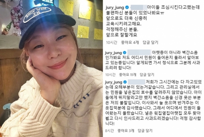 정주리는 "그 시간에는 다 자고 있었는데 오해가 있는 것 같다. 관리실에서는 민원 넣은 집의 호수를 알려주지 않았다"며 "아이들에게 뛰지 말라고만 했다. 벽간소음을 신경 쓰지 못 한 건 제 불찰"이라고 해명했다.