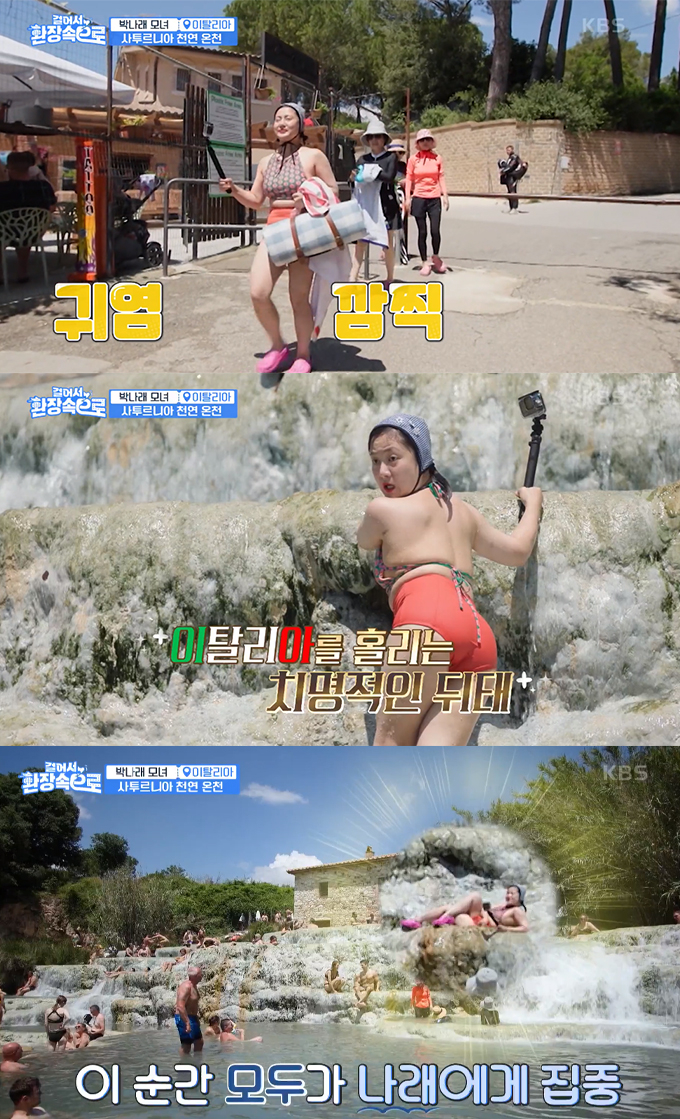지난 6일 방송된 KBS2 예능프로그램 '걸어서 환장 속으로'(이하 '걸환장') 26회에서는 엄마, 엄마 절친들과 이탈리아 로마 여행 중인 박나래가 사투르니아 천연 온천을 찾은 모습이 전파를 탔다.